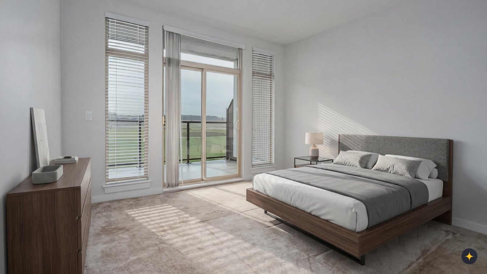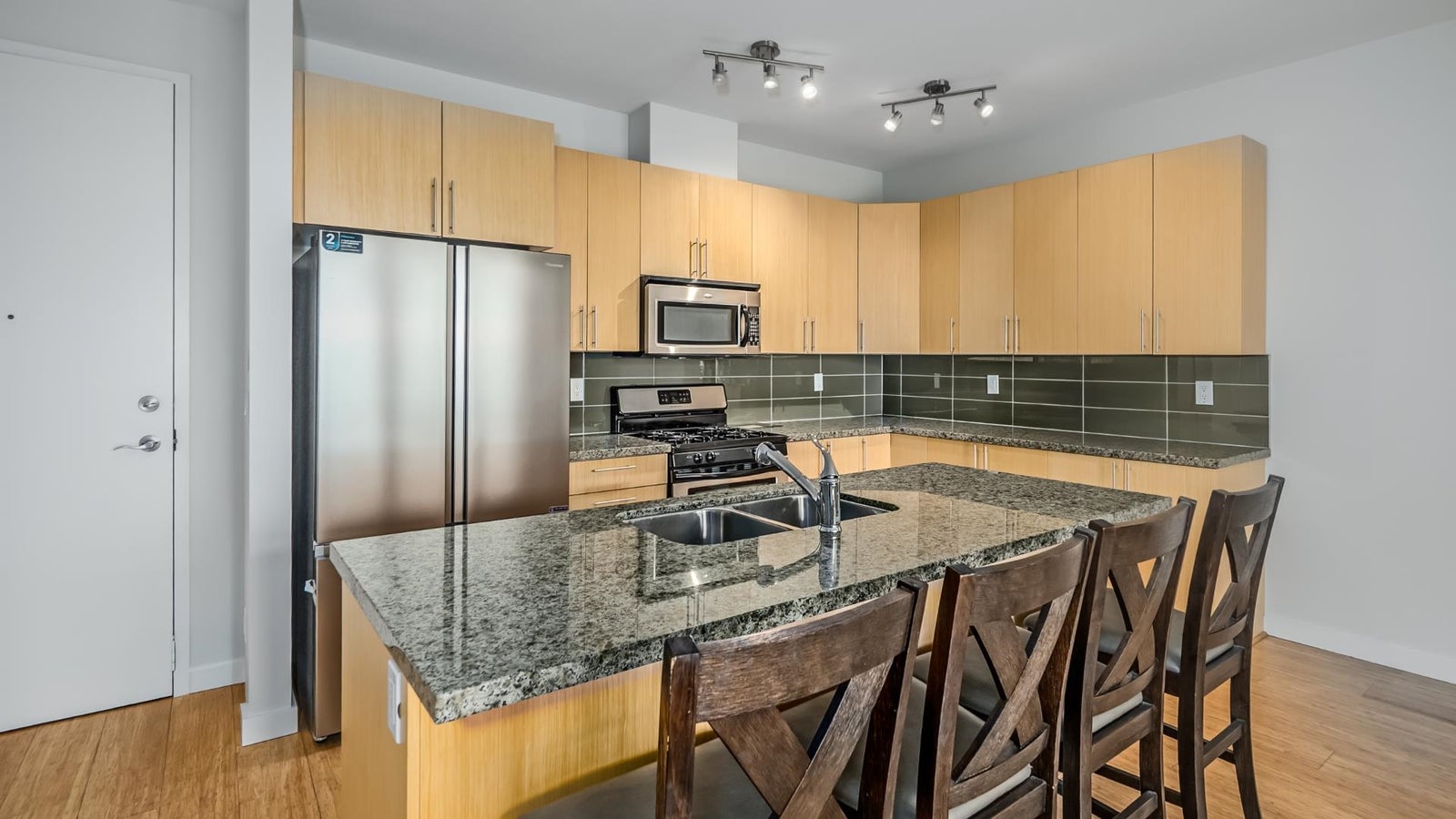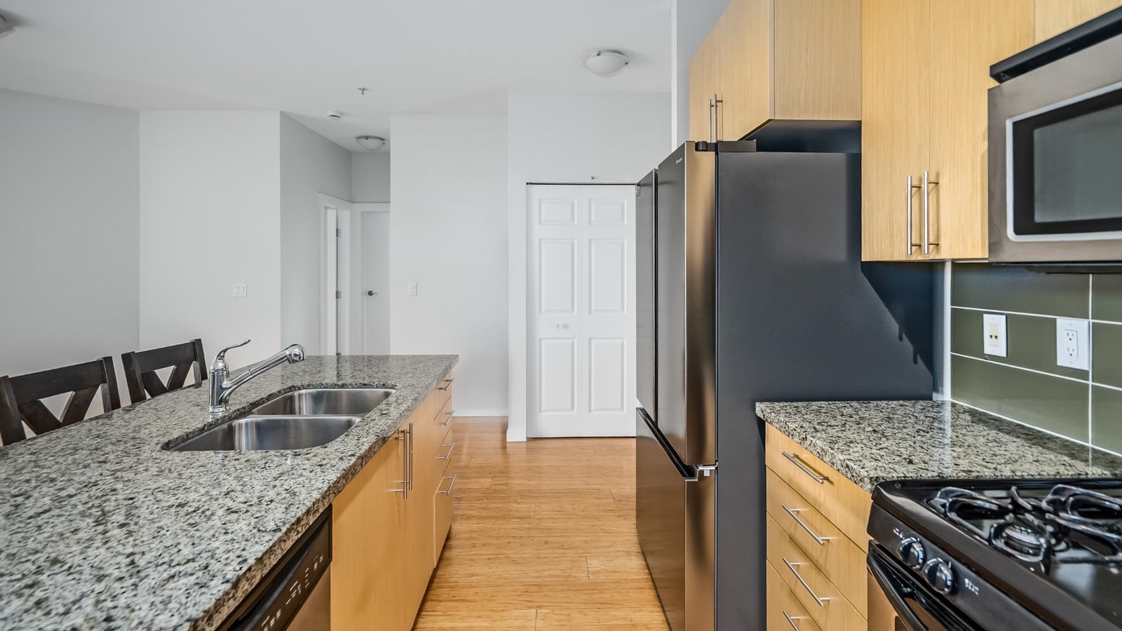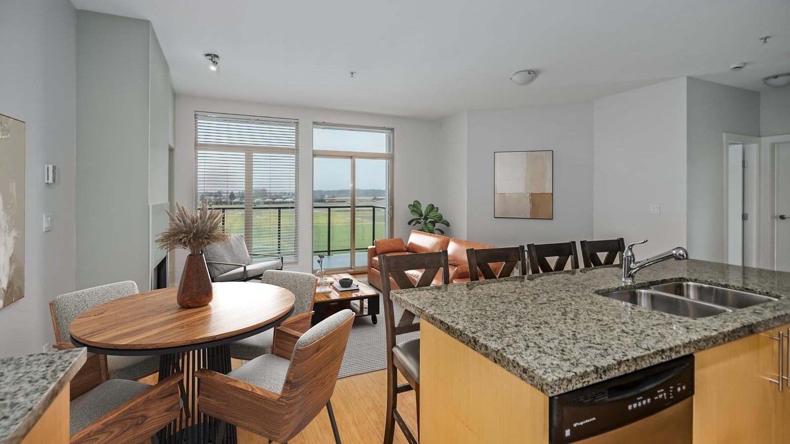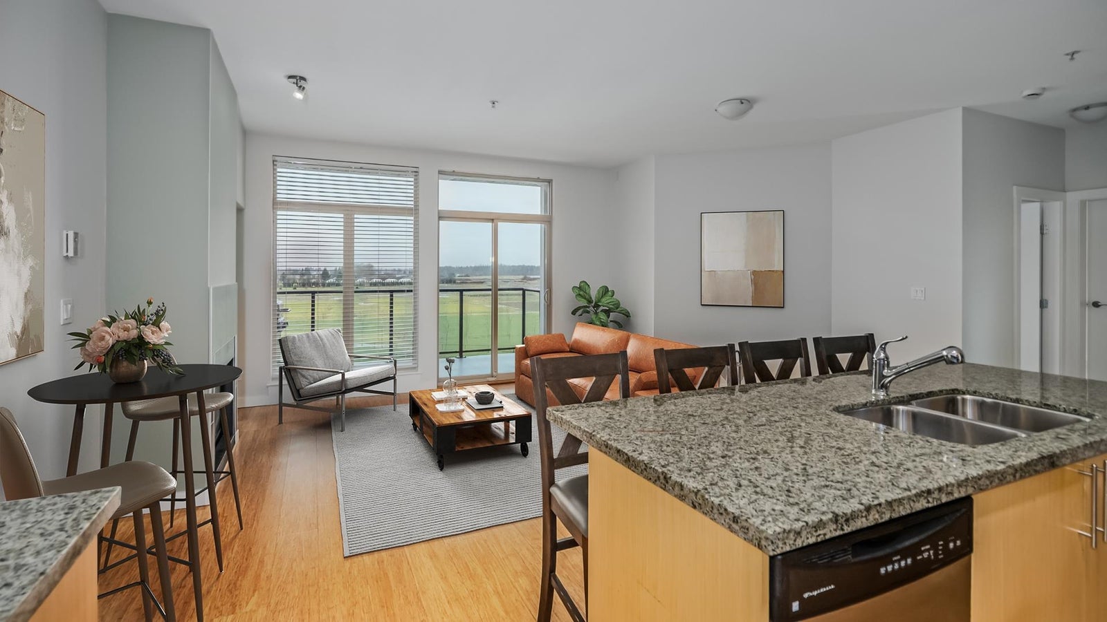 Stunning & tranquil farmland views from every room in this gorgeous 2 bed 2 bath & 2 balcony home. Contemporary open floor plan & chef's kitchen with eating bar for easy entertaining. Boasting granite counter tops, 9 foot ceilings, two balconies with combined 239 square feet of space, generous cabinetry, glass tiled back splash & bamboo flooring this home is a true gem! Added value of fresh painting throuhgout March 2026 and brand new state of the art stainless steel fridge. Gas BBQ included. Steps to the South Dyke Trail, short stroll to the heart of Steveston Village. Open House March 28 & 29 2:00-4:00 PM